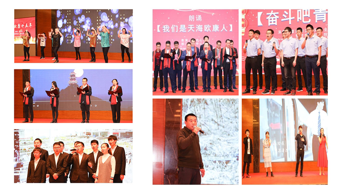 ? ? ? ? 尾牙宴期間,對2019年度優秀團隊、優秀員工、技術精英、十年功勛等獲獎部門及員工進行表彰。同時,對本年度終驗項目的所有參與員工進行表彰。天海歐康的過往與未來離不開各位員工兢兢業業的努力,希望所有天海歐康人“只爭朝夕、不負韶華”。