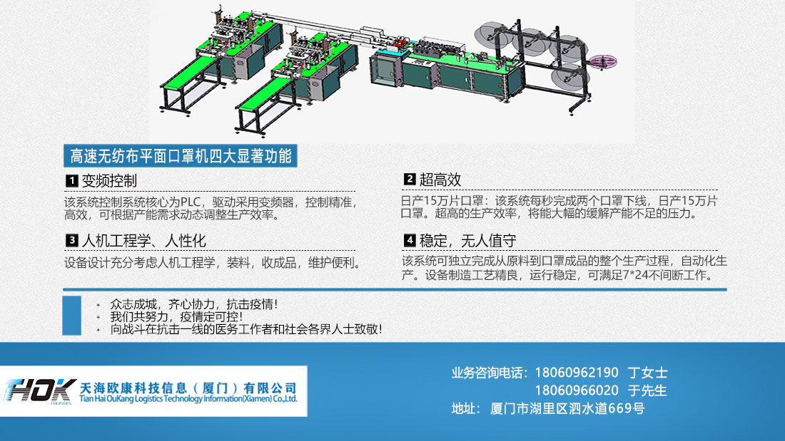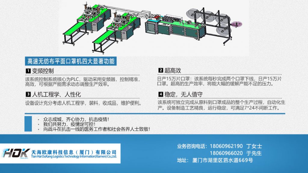 28 2月 天海歐康研發打造 高速無紡布平面口罩機 時間: 17:57 分類: 公司新聞 作者: THOK 0 喜歡 分享 交期:3月5日前簽訂合同,35天交貨 價格:65萬人民幣(含稅出廠價) 付款方式:支付合同總金額50%的預付款,50%提貨前付清 業務咨詢電話:180-6096-2190 丁女士 180-6096-6020 于先生 歡迎來電咨詢! 標簽: 天海歐康