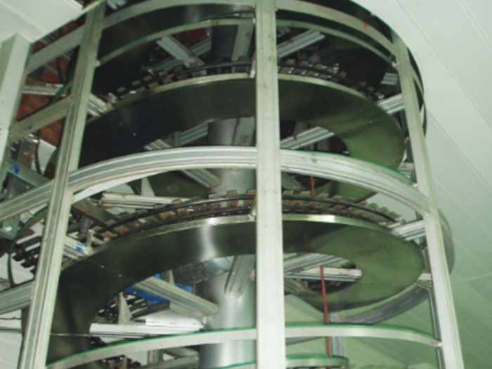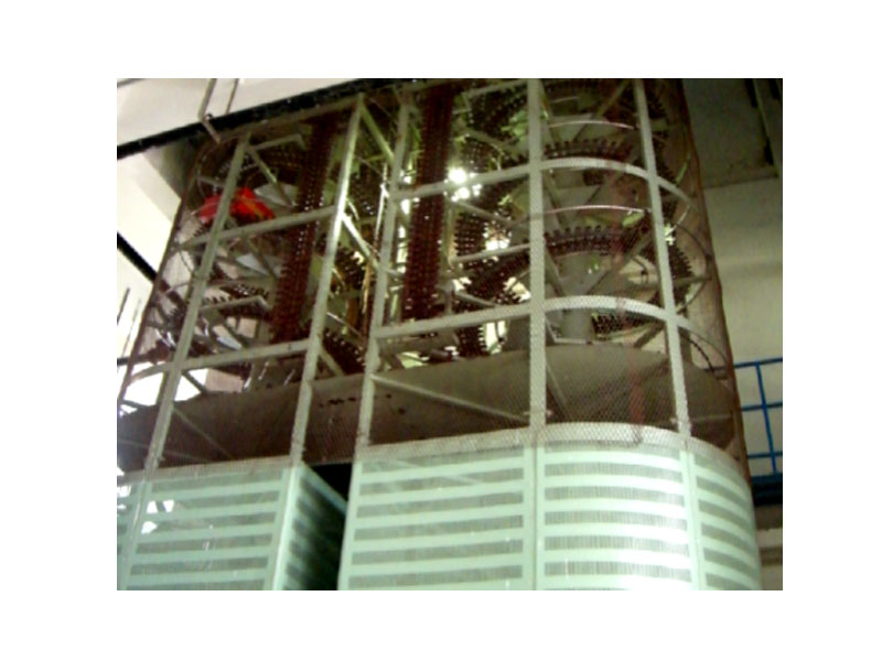 箱體螺旋升降機是利用可轉(zhuǎn)彎鏈條作為傳動機構(gòu),在鏈條的上面配以承載鏈板作為輸送支承,在鏈條的兩邊配以特殊材料制作的滑塊,滑塊嵌入兩側(cè)安裝的作為輸送導向的螺旋狀導軌,通過滑塊沿螺旋導軌的滑動,實現(xiàn)箱體在螺旋面上的上升或下降輸送。