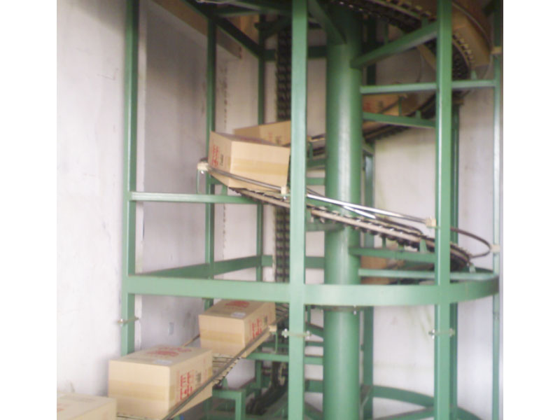 箱體螺旋升降機是利用可轉(zhuǎn)彎鏈條作為傳動機構(gòu),在鏈條的上面配以承載鏈板作為輸送支承,在鏈條的兩邊配以特殊材料制作的滑塊,滑塊嵌入兩側(cè)安裝的作為輸送導向的螺旋狀導軌,通過滑塊沿螺旋導軌的滑動,實現(xiàn)箱體在螺旋面上的上升或下降輸送。